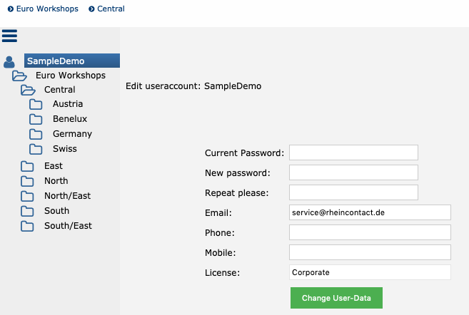 Du kannst deine eigenen Benutzerinformationen (Passwort, Email, und Telefonnummer) ändern indem du auf deinen Benutzernamen, der in der linken oberen Ecke angezeigt wird anklickst: