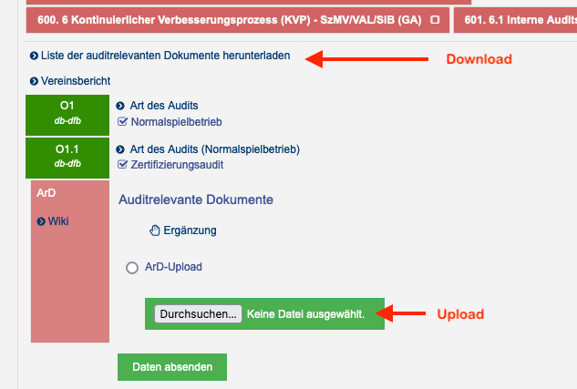 Den Link zum Download finden Sie unter dem Reiter "Audit", links oben. Der Upload erfolgt über das Datei-Auswahlfeld unter "Auditrelevante Dokumente":