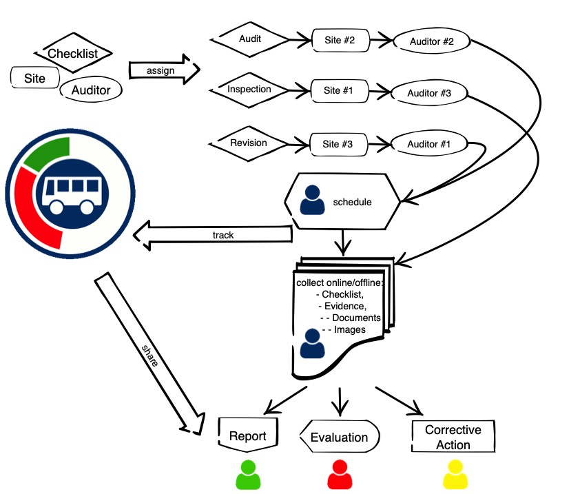 Als Projekt-Manager planen Sie Audits ganz einfach durch die Verteilung der Fragebögen auf Standorte und Auditoren. Die Auditoren planen selbständig ihre Termine und erfassen die Audits direkt Online im Web-Browser oder Offline mit dem Smartphone oder Tablett. Sie können alle Projektfortschritte und die Zwischenergebnisse in Ihrem Webbrowser verfolgen.