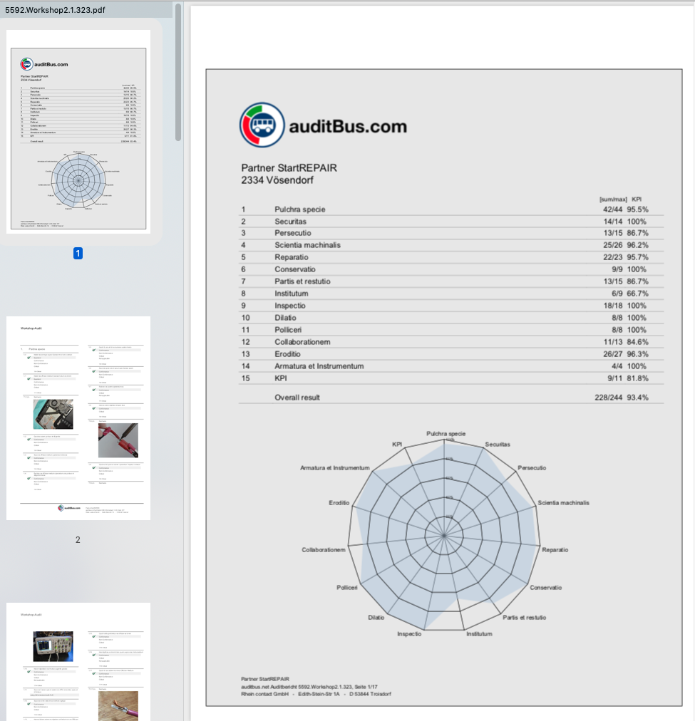 Natürlich liefert auditBus eine vollständige und für den Versand optimierte Dokumentation des Audits als PDF. Der übersichtliche Standardbericht enthält alle Fragen, Antworten, Kommentare, Bildnachweise und Dokumentanhänge des Audits.