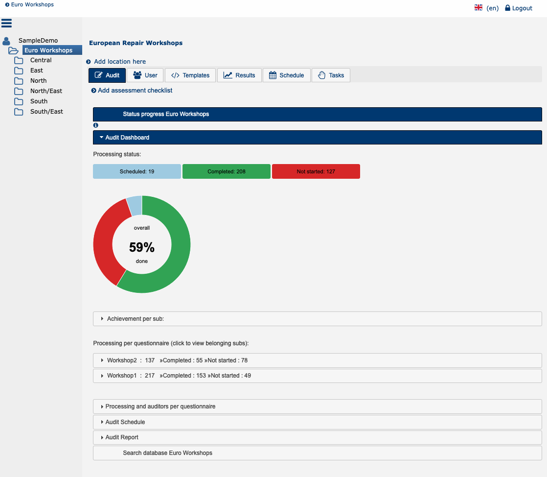Im auditBus hat Ihr Team jederzeit und überall umfassende Kontrolle. Das Assessment-Dashboard zeigt für jede Inhaltsebene die aktuellen Fortschritte der Gruppe auf einen Blick: Die Anzahl geplanter Audits und wie viele Audits davon jeweils fertiggestellt oder noch nicht begonnen wurden. Unangenehme Überraschungen sind in Zukunft ausgeschlossen.
