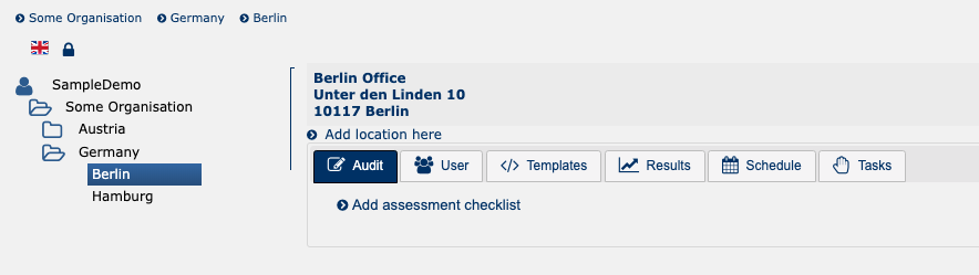 Standorte und Gruppen zeigt auditBus Ihnen im Menübaum auf der linken Seite. Um die Inhalte einer Gruppe zu sehen, öffnen Sie den jeweiligen Ordner durch Klick auf das Ordner-Icon. Um eine Ebene oder einen Standort auszuwählen, klicken Sie auf den angezeigten Namen. Die vorhandenen Daten zum aktuell gewählten Standort werden im Seitenkopf über den Reitern Ihres Desktops angezeigt. Um die Standort-Informationen zu ändern, klicken Sie auf den Namen oder die Adresse im Seitenkopf.