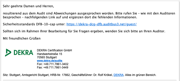 Für die "Sicherheitsstandards DFB" - Checkliste ist die Zuweisung an einen externen E-Mail Empfänger deshalb bereits vorbereitet. Jeder aus "Sicherheitsstandards DFB" erzeugte Maßnahmenplan ist bereits für den Versand an eine E-Mail Adresse konfiguriert. Wenn du bei Frage O1.3.1 eine Mailadresse bereits eingetragen hast, wird diese automatisch in den Maßnahmenplan übernommen: