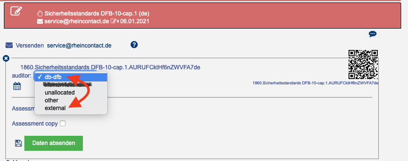 Du kannst jeden auditBus - Fragebogen an einen externen Benutzer delegieren indem du die Checkliste statt einem registrierten Benutzer einer Mail-Adresse zuweist. Diese Möglichkeit ist vor allem für Maßnahmenpläne gedacht - geeignete Maßnahmen und Verantwortlichkeiten werden i.d.R. von, oder zumindest in Abstimmung mit den Auditees festgelegt.