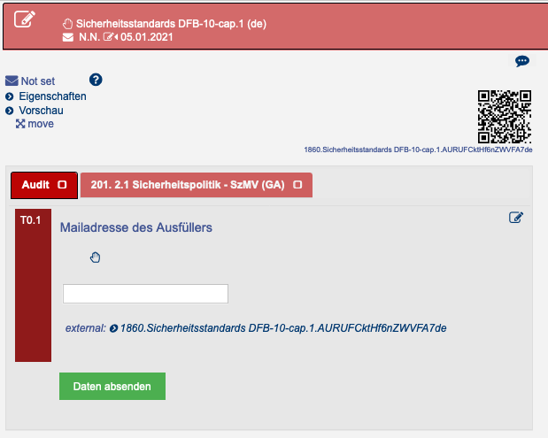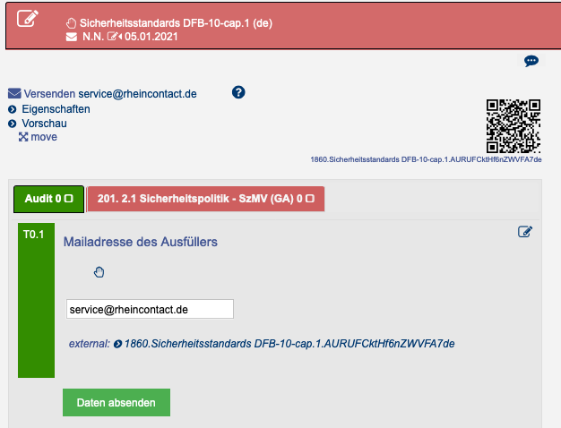 Selbstverständlich kannst du die Einstellung für einen externen Benutzer auch nachträglich vornehmen. Zu diesem Zweck öffnest du den Maßnahmenplan und trägst die Adresse in das Feld T0.1 "Mailadresse des Ausfüllers" unter "Audit" ein: